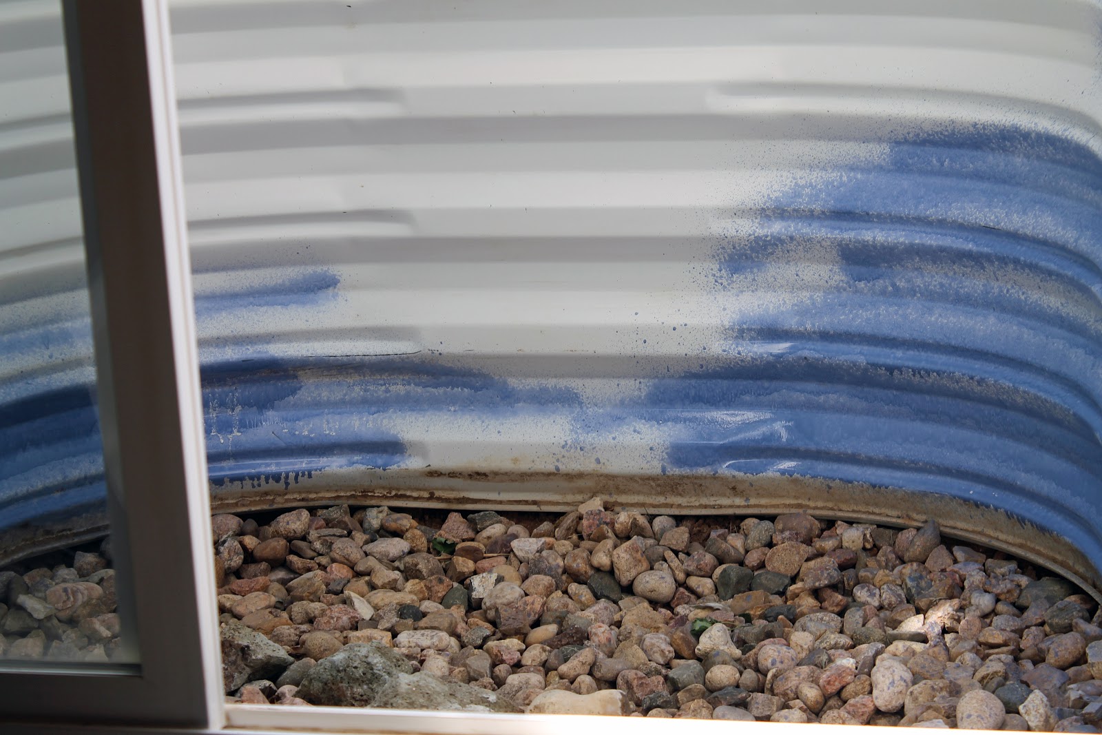 We also knew we should have good drainage (since we don't want moisture getting into the basement) so we started by putting a layer of rocks at the bottom of the window well and cleaned the sides of the surround with soap and water to get it ready for spray painting. This was the original color we were going to use but it was too dark and wanted a blue sky background. This looked more like a night sky.